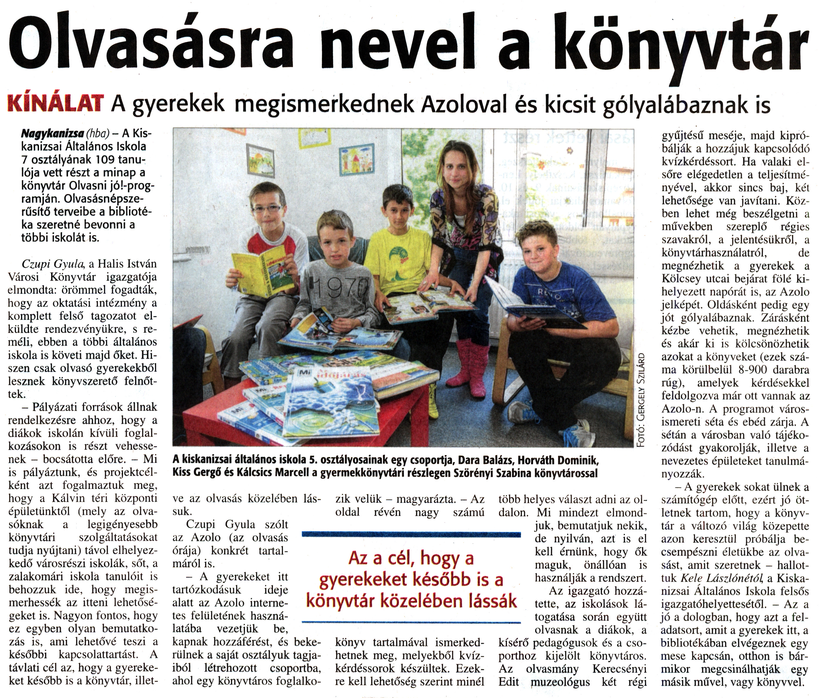 Nyilvános 2512 | 4942 | Zalai Hírlap 2014. május 8. 106. szám 4. oldal - Olvasásra nevel a könyvtár | Olvasásra nevel a könyvtár KÍNÁLAT A gyerekek megismerkednek Azoloval és kicsit gólyalábaznak is Nagykanizsa (hba) - A Kiskanizsai Általános Iskola 7 osztályának 109 tanulója vett részt a minap a könyvtár Olvasni jó!-programján. Olvasásnépszerűsítő terveibe a bibliotéka szeretné bevonni a többi iskolát is. Czupi Gyula, a Halis István Városi Könyvtár igazgatója elmondta: örömmel fogadták, hogy az oktatási intézmény a komplett felső tagozatot elküldte rendezvényükre, s reméli, ebben a többi általános iskola is követi majd őket. Hiszen csak olvasó gyerekekből lesznek könyvszerető felnőttek. - Pályázati források állnak rendelkezésre ahhoz, hogy a diákok iskolán kívüli foglalkozásokon is részt vehessenek - bocsátotta előre. - Mi is pályáztunk, és projektcélként azt fogalmaztuk meg, hogy a Kálvin téri központi épületünktől (mely az olvasóknak a legigényesebb könyvtári szolgáltatásokat tudja nyújtani) távol elhelyezkedő városrészi iskolák, sőt, a zalakomári iskola tanulóit is behozzuk ide, hogy megismerhessék az itteni lehetőségeket is. Nagyon fontos, hogy ez egyben olyan bemutatkozás is, ami lehetővé teszi a későbbi kapcsolattartást. A távlati cél az, hogy a gyerekeket később is a könyvtár, illetve az olvasás közelében lássuk. Czupi Gyula szólt az Azolo (az olvasás órája) konkrét tartalmáról is. - A gyerekeket itt tartózkodásuk ideje alatt az Azolo internetes felületének használatába vezetjük be, kapnak hozzáférést, és bekerülnek a saját osztályuk tagjaiból létrehozott csoportba, ahol egy könyvtáros foglalkozik velük - magyarázta. - Az oldal révén nagy számú könyv tartalmával ismerkedhetnek meg, melyekből kvízkérdéssorok készültek. Ezekre kell lehetőség szerint minél több helyes választ adni az oldalon. Mi mindezt elmondjuk, bemutatjuk nekik, de nyilván, azt is el kell érnünk, hogy ők maguk, önállóan is használják a rendszert. Az igazgató hozzátette, az iskolások látogatása során együtt olvasnak a diákok, a kísérő pedagógusok és a csoporthoz kijelölt könyvtáros. Az olvasmány Kerecsényi Edit muzeológus két régi gyűjtésű meséje, majd kipróbálják a hozzájuk kapcsolódó kvízkérdéssort. Ha valaki elsőre elégedetlen a teljesítményével, akkor sincs baj, két lehetősége van javítani. Közben lehet még beszélgetni a művekben szereplő régies szavakról, a jelentésükről, a könyvtárhasználatról, de megnézhetik a gyerekek a Kölcsey utcai bejárat fölé kihelyezett napórát is, az Azolo jelképét. Oldásként pedig egy jót gólyalábaznak. Zárásként kézbe vehetik, megnézhetik és akár ki is kölcsönözhetik azokat a könyveket (ezek száma körülbelül 8-900 darabra rúg), amelyek kérdésekkel feldolgozva már ott vannak az Azolo-n. A programot városismereti séta és ebéd zárja. A sétán a városban való tájékozódást gyakorolják, illetve a nevezetes épületeket tanulmányozzák. - A gyerekek sokat ülnek a számítógép előtt, ezért jó ötletnek tartom, hogy a könyvtár a változó világ közepette azon keresztül próbálja becsempészni életükbe az olvasást, amit szeretnek - hallottuk Kele Lászlónétól a Kiskanizsai Általános Iskola felsős igazgatóhelyettesétől. - Az a jó a dologban, hogy azt a feladatsort, amit a gyerekek itt, a bibliotékában elvégeznek egy mese kapcsán, otthon is bármikor megcsinálhatják egy másik művel, vagy könyvvel. A kiskanizsai általános iskola 5. osztályosainak egy csoportja. Dara Balázs, Horváth Dominik, Kiss Gergő és Kálcsics Marcell a gyermekkönyvtári részlegen Szörényi Szabina könyvtárossal |